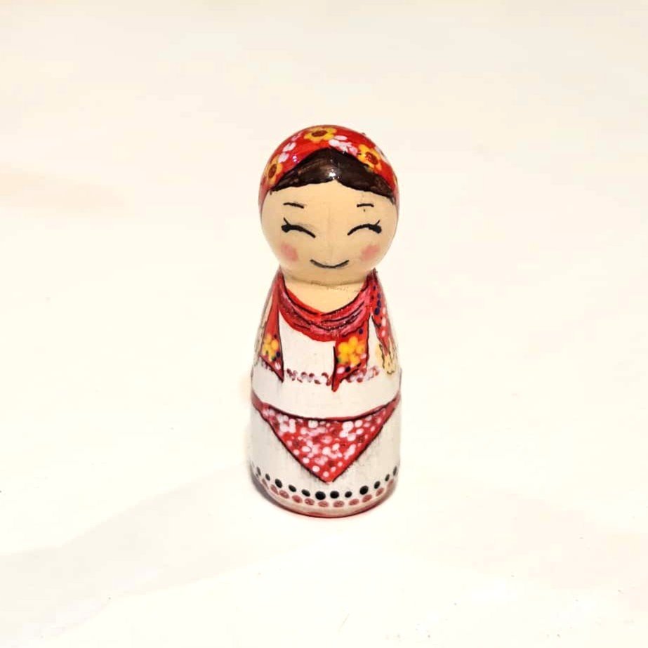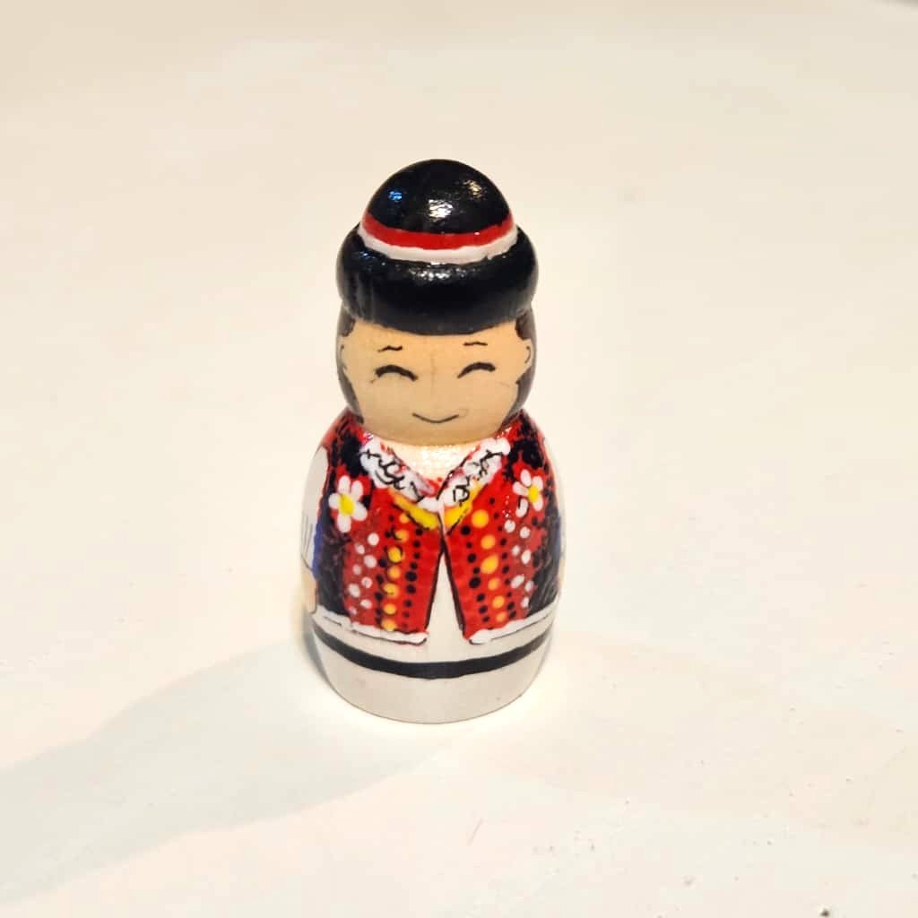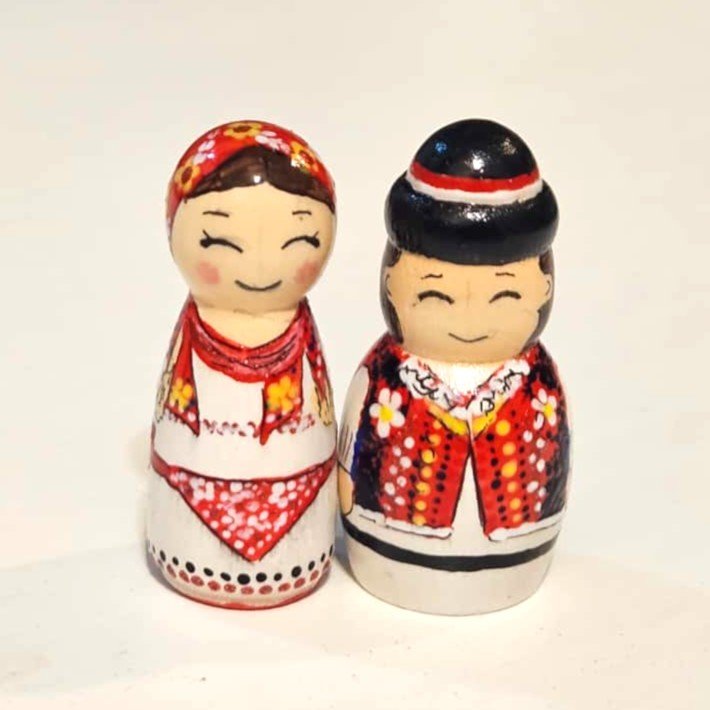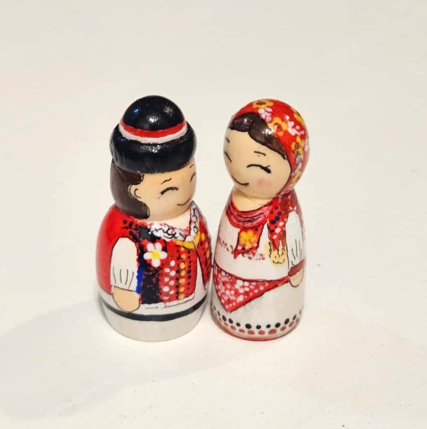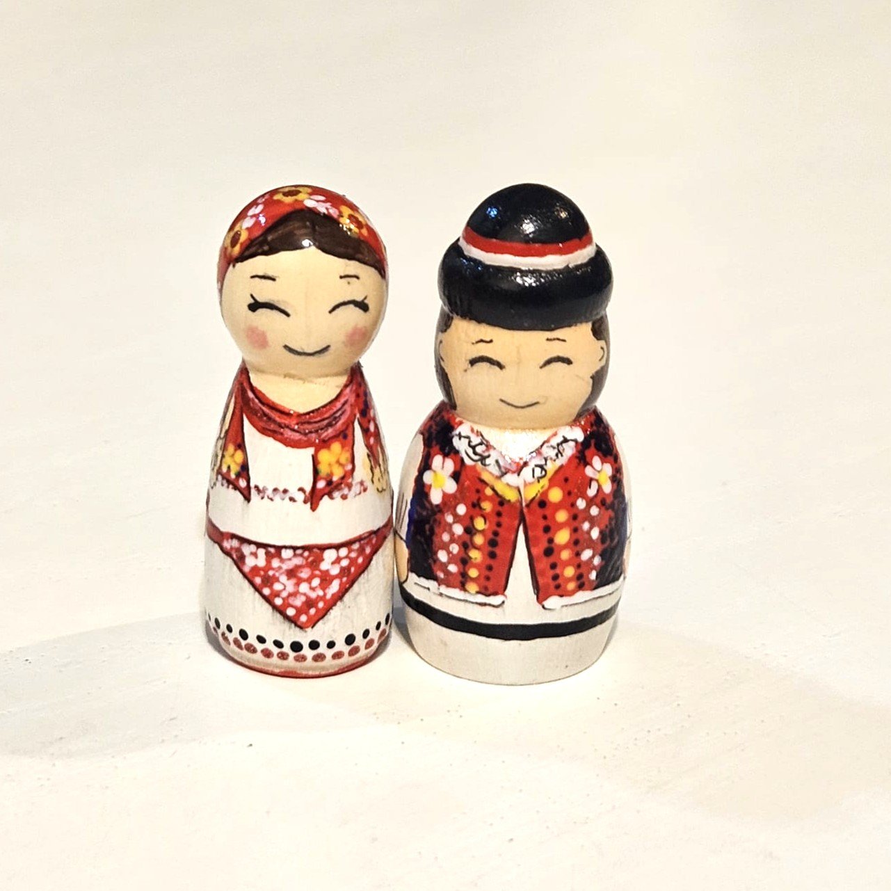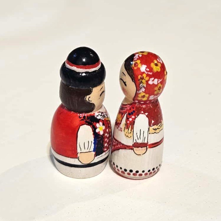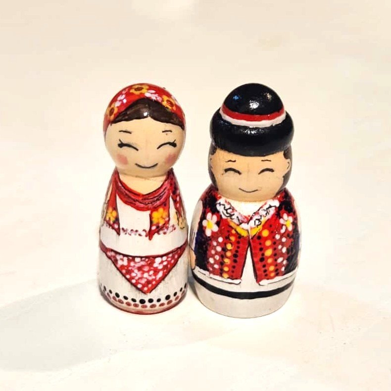 Unikatni ručno izrađeni drveni par od peg lutkica inspiriran tradicionalnom hrvatskom narodnom nošnjom.